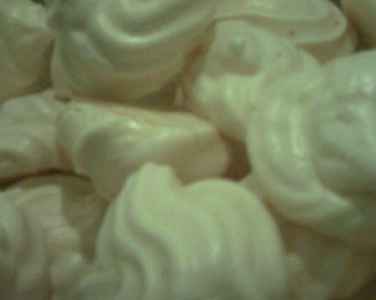 Finire di montare a neve ben ferma gli albumi, riempire una sacca da pasticcere e formare tante "nuvole" su una placca da forno ricoperda di carta da forno.